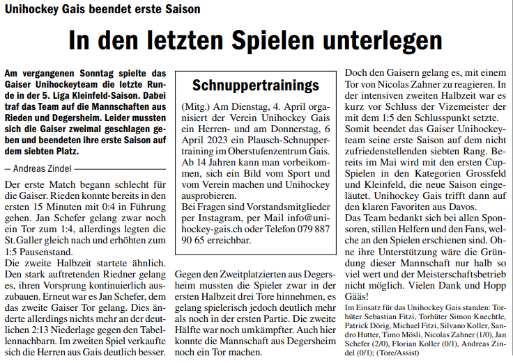 Die Herren des Unihockey Gais hatten sich etwas vorgenommen. Die Freude über dieses Spiel war riesig und insgesamt 12 Kaderspieler nahmen am Testspiel teil. Die ersten 20 Minuten des Testspiels liefen sehr ausgeglichen, während Teufen/Bühler das Spiel machte, nutzten wir die Kontergelegenheiten und konnten deshalb gut mithalten. Im zweiten Drittel funktionierte dies leider nicht mehr wie gewünscht. Der Gegner nutzte unsere Fehler aus und wir kamen selbst nur noch selten zu guten Gelegenheiten. Im dritten Drittel wollten wir es noch einmal besser machen und unsere grössere Spieleranzahl ausnutzen. Dies gelang, wir kamen wieder besser ins Spiel und konnten auch mehr Chancen verzeichnen. Dennoch musste wir am Ende als deutliche Verlierer vom Platz, wissen nun aber, das es noch viel zu tun gibt und freuen uns auf eine Revanche und weiter Testspiele in dieser Art.